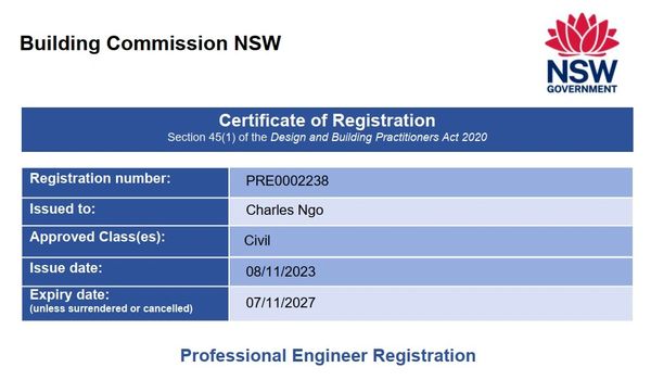 ✅ We are fully registered under the DBP Act as both a Professional Engineer and Design Practitioner, ensuring that our work is legally compliant, high quality, and officially recognised by the NSW Building Commission. Not all engineers and inspectors are registered under the DBP, without the NSW Building Commission registration, they cannot work on regualted designs and construction of these buildings
